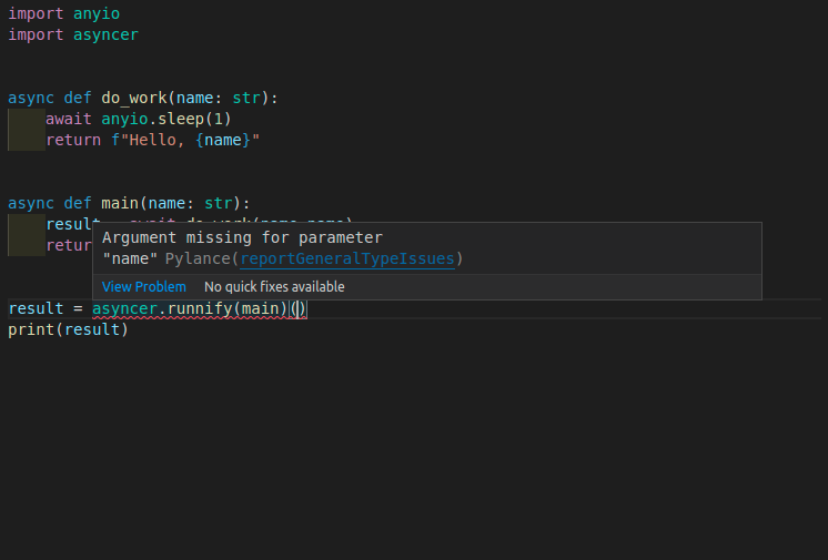 If you run that, you will see the expected result, almost the same as with AnyIO, it will wait for 1 second and then print Hello, World